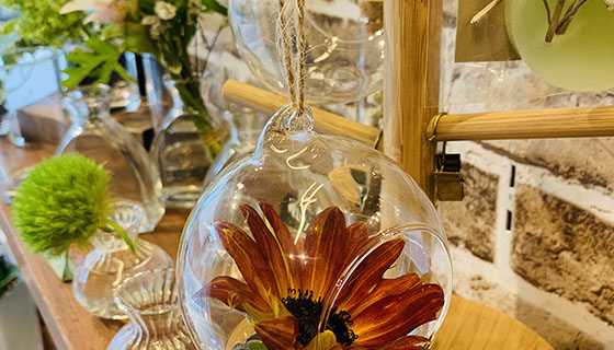明るくナチュラルを目指して作った小さな店内は壁から天井、テーブルまですべて手作りの空間で、お花と一緒に温かみを感じてもらえると嬉しいです。